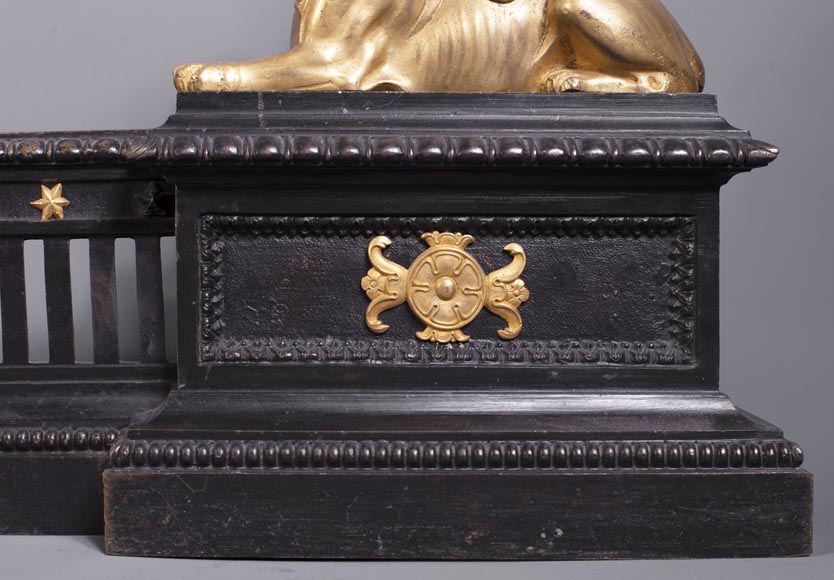 Barre de chenets en bronze doré et patiné, de style Empire, à décor de deux sphinx ailés couchés. Barre centrale à étoiles.