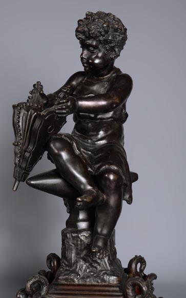 Paire de chenêts en bronze et rouge antique représentant des petits forgerons