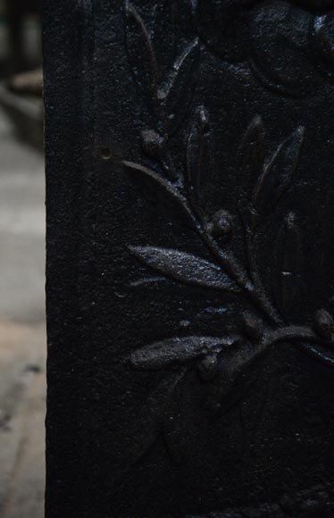 Cette ancienne plaque de cheminée de style Louis XVI a été réalisée au XVIIIème siècle. Tandis que deux coeurs brûlent sur un autel orné de branches de lauriers, un putti volant dans le ciel tient dans l’une de ses mains une couronne de feuilles et dans l’autre une flèche qui pointe vers l’autel.