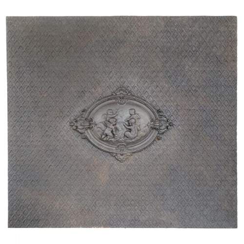 Plaque de cheminée ornée d’instruments de musique antiques entourés d’une couronne de laurier