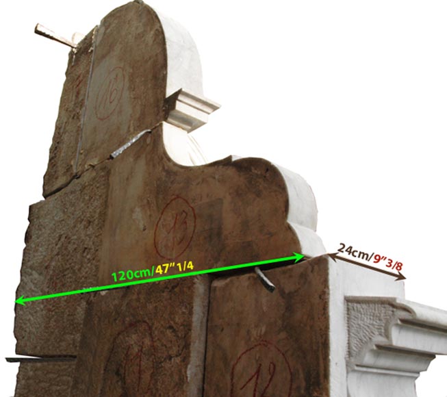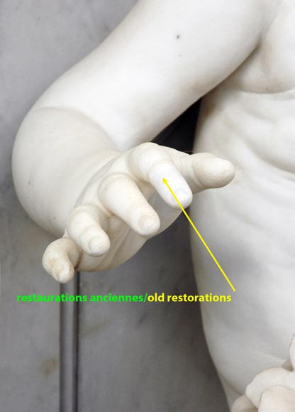 Cette fontaine d'angle présente une architecture et un décor en marbre de Carrare, et en Carrare Statuaire pour la figure centrale de la jeune enfant. Elle offre une symétrie parfaite.