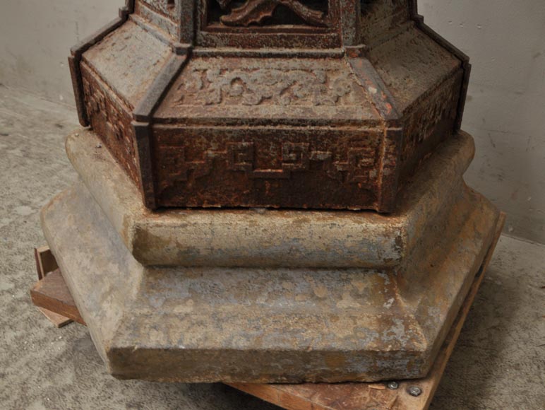 Pièce rare, cette grande jardinière de style chinoisante a été réalisée en fonte de fer dans le courant du XXè siècle. Le piètement hexagonal est orné d'un décor ajouré de feuillages et de fleurs. La jardinière en elle-même est à pans coupés et est décorée d'un grand dragon plaqué sur sa panse. Des motifs de calligraphie chinoise ornent également la panse de la jardinière.