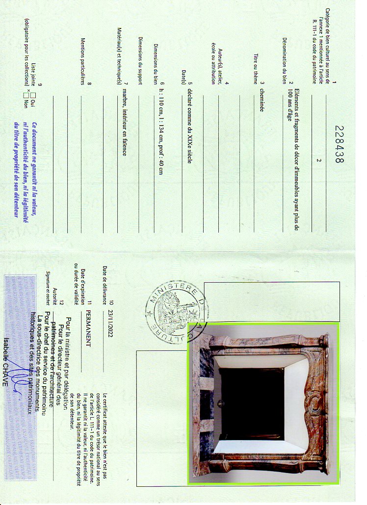 Cette cheminée est vendue avec son intérieur en faïence d'origine et sa dalle foyère qui est cassée mais sera restaurée par nos soins.