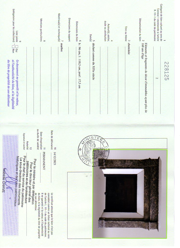 Cette cheminée est vendue sans rétrécissement ni dalle foyère mais ceux-ci pourront être fabriqués à la demande (selon disponibilité du marbre).