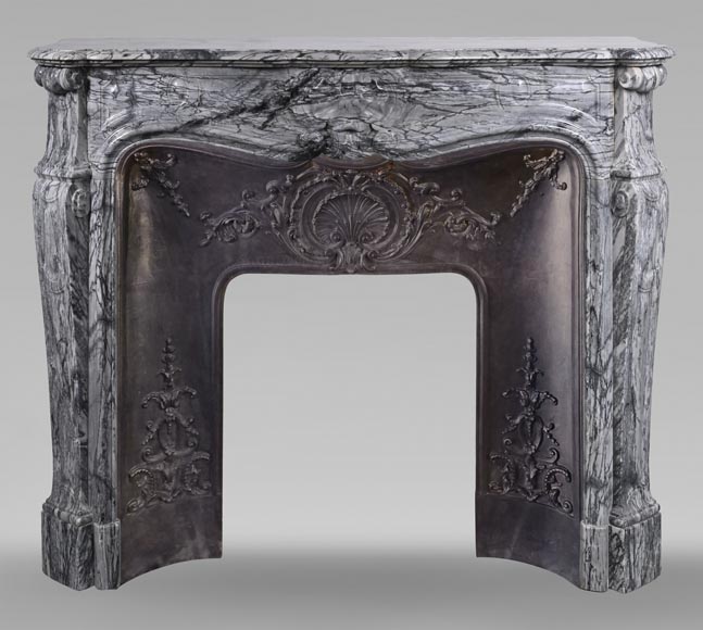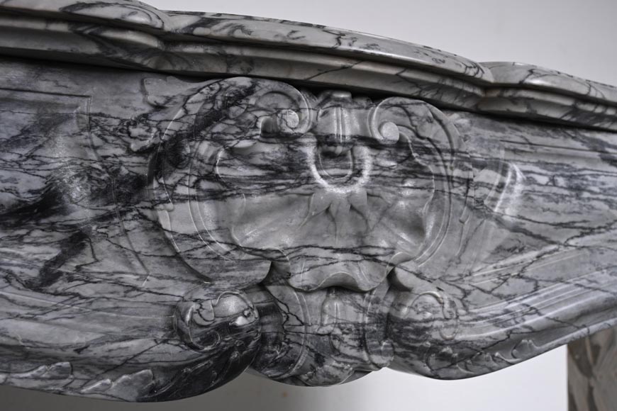 Cheminée de style Louis XV ornée d'une coquille sculptée en marbre Bleu Fleury