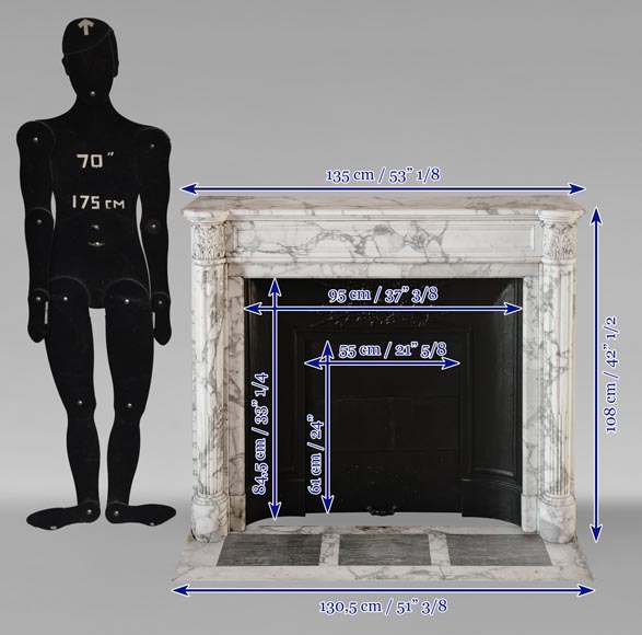 Cette cheminée de style Louis XVI à demi-colonnes est faite en marbre Arabescato. Le marbre Arabescato est un marbre blanc veiné de gris ou de noire. Il fait partie des marbres blancs de Carrare, de ce fait ses principales carrières se trouvent dans le bassin de Carrare en Italie, à Seravezza Lucca.