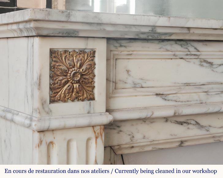 Cheminée de style Louis XVI en marbre d'Arabescato décorée d'une guirlande de fleurs en bronze doré
