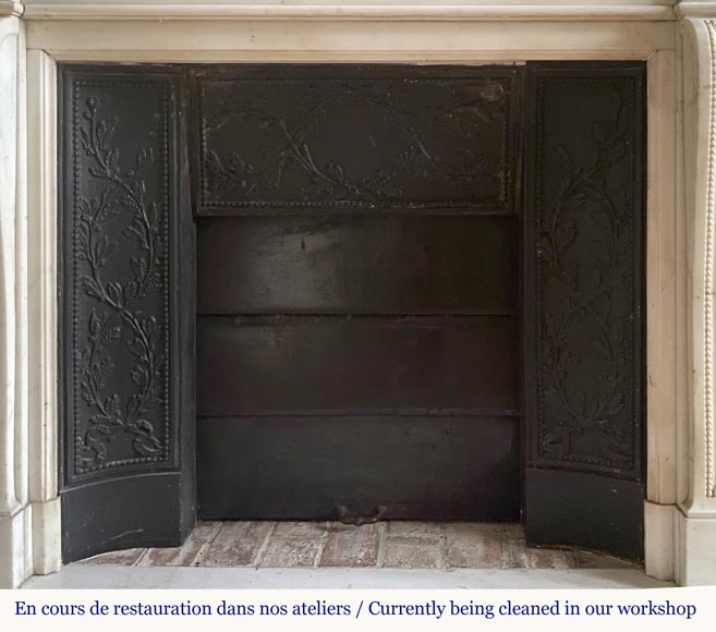 Cette belle cheminée de style Louis XVI a été réalisée à la fin du XIXe siècle en marbre de Carrare.