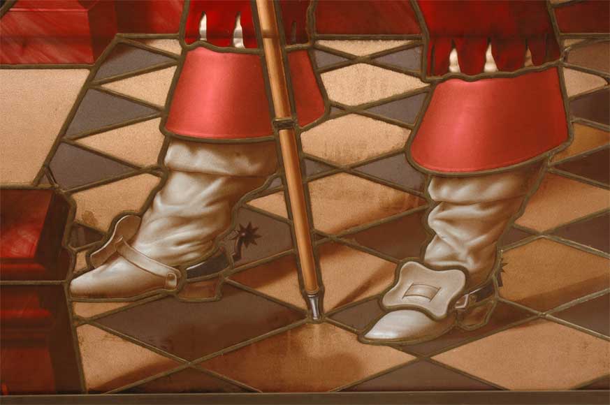 Ce vitrail à décor de mousquetaire est d'une exceptionnelle qualité. Son décor et la technique de réalisation sont d'une rare finesse. Ce vitrail est signé "Bitterlin Paris 1883".