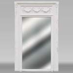 L'encadrement du miroir rectangulaire est orné de liserés perlés et est surmonté d'un ruban noué. Le fronton présente quant à lui un décor de rosettes dans les angles.
