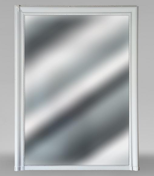 Ce trumeau de style Louis XVI suit la forme d’un simple encadrement rectangulaire mouluré. Tandis qu’un boudin plus imposant orne le cadre vers l’extérieur, une petite frise décorative fait la transition entre l’encadrement et l’intérieur.