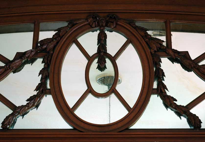 Boiserie ancienne en chêne de style Louis XVI. Une porte à trois battants est surmontée d'un tympan vitré orné en son centre d'un oeil-de-boeuf. Les vitres sont séparées les unes des autres par des montants de bois adoptant une forme courbée. Ce tympan est garni de guirlandes végétales sculptées dans le bois. Entre le tympan et la porte se développe une frise sculptée d'entrelacs et de feuillages. Les trois panneaux de la porte sont décorés de panneaux rectangulaires moulurés dont celui du centre est garni d'une guirlande feuillagée réalisée en stuc et rehaussée de dorures. La poignée est le fruit d'un beau travail de bronzier. Une deuxième porte à deux battants est surmontée du même type de tympan que la première et de la même frise sculptée. Néanmoins, les panneaux de porte ne sont pas les mêmes : ces derniers sont vitrés dans toutes leur partie haute. Leur partie basse est ornée d'un panneau rectangulaire mouluré. Une troisième porte, simple cette fois, est décorée de la même manière que la première. Tout le pourtour de la pièce est garni de boiseries dans la partie basse des murs. Il s'agit de panneaux rectangulaires moulurés et ornés de petits macarons en stuc doré. Ils sont séparés les uns des autres par des pilastres cannelés. Cette pièce de boiserie comporte aussi un cache radiateur réalisé dans le même esprit.