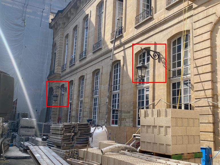 Leur dessin s’inspire des élégances du XVIIIe siècle français : la structure ajourée présente un chapiteau bombé, souligné par de fines moulures, et se prolonge en un fût vitré aux arêtes galbées, offrant ainsi une diffusion généreuse de la lumière. Le support mural, finement travaillé, affiche de belles volutes .