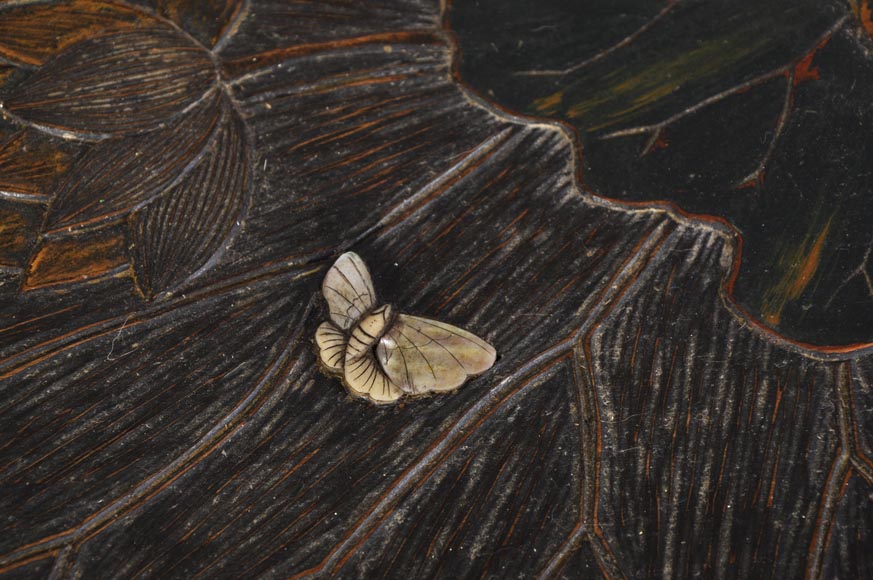 Cette table à thé est de style japonisant par sa forme simple, organique, ses lignes courbes, par son matériau – le bambou – et par le décor gravé et laqué et les incrustations de nacre sur les plateaux. Il s'agit de décors végétaux et floraux tendant vers une certaine abstraction et simplification des formes. Un papillon blanc en nacre est incrusté sur le plateau supérieur.