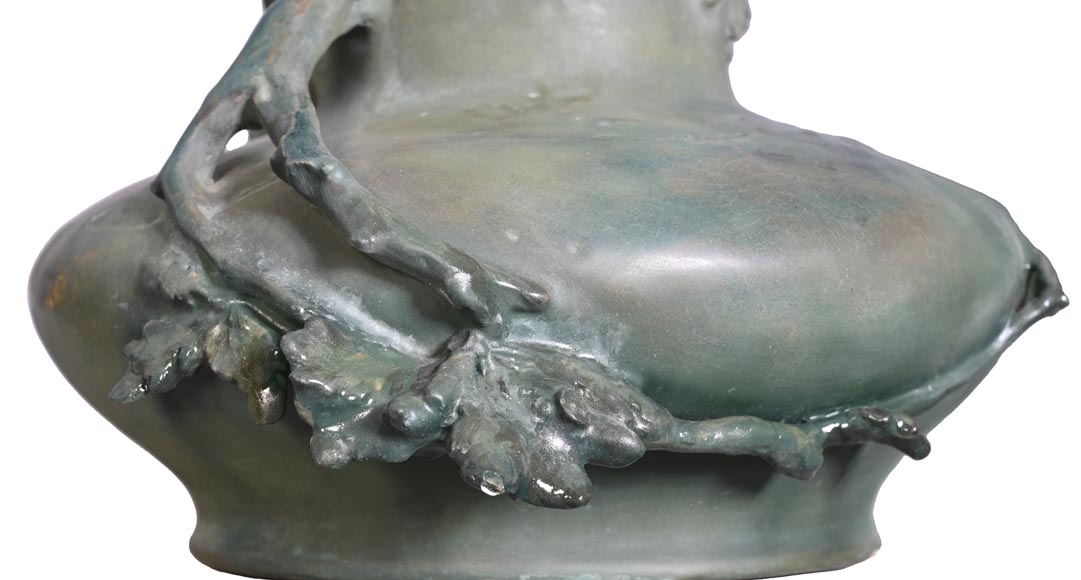 Autour de ce vase à la panse applatie et au col cylindrique évolue un branchage de chêne qui ajoute à la fois de la structure et de la légèreté à l’ensemble. La branche soutient le poids d’un hibou qui observe le contenant. L’ensemble est émaillé d’un vert dont les reflets varient entre des nuances plus soutenues et d’autres plus ternes. Un effet mordoré vient mettre en évidence tous les reliefs de la pièce. Cet émail nous rappelle un bronze sur lequel le temps aurait développé une patine vert-de-gris.
