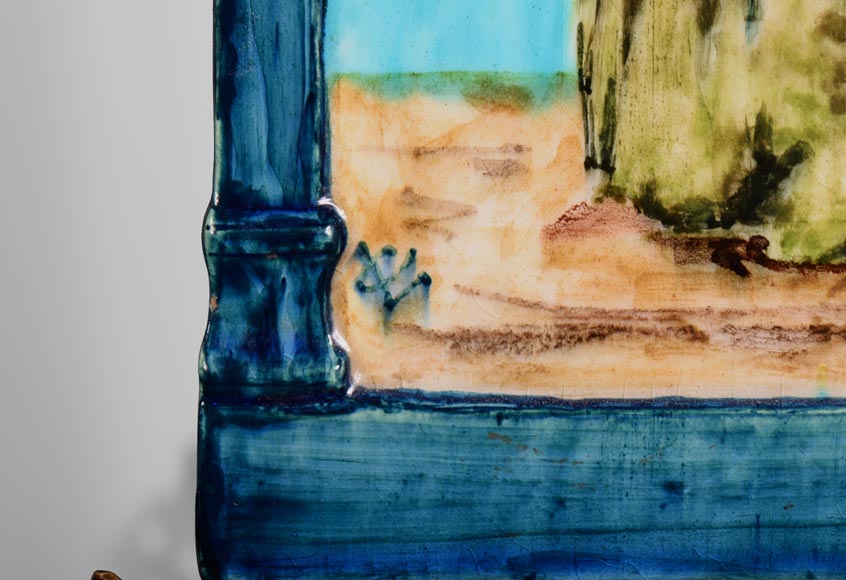 Cette paire de vases, en faïence à décor de personnages en costume d'époque, est datée 1882. On note la qualité du décor peint et la présence du monogramme "AE". L'ensemble est monté par un décor en bronze ciselé à patine brune représentant des griffons déployant leurs ailes.