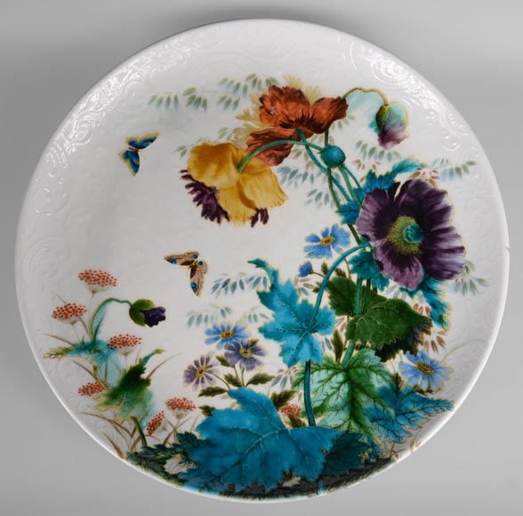 Théodore DECK, Plat circulaire à décor de fleurs et papillons, vers 1880-1890