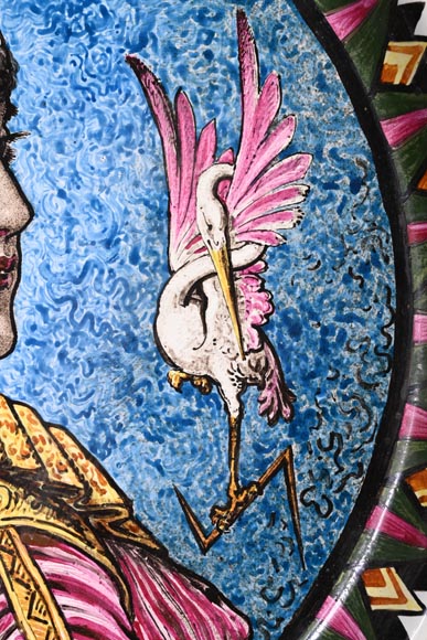 Les décors des deux plats se répondent, tant d’un point de vue chromatique que dans le choix et la posture des personnages. Le profil de l’homme semble sévère, en dépit de ses lèvres, relevées dans un sourire. À ses longs cheveux répond une barbe tout aussi fournie. Il porte une boucle d’oreille et sa tunique somptueuse mêle l’or et le vert. La figure féminine se détache quant à elle sur un fond bleu. Sa parure est éminemment orientale : sa robe est bordée d’or ; ses longs cheveux noirs sont coiffés d’un voile retenu sur les côtés par deux serpents et par une large bande dorée. Devant elle, un oiseau blanc au long bec jaune enroule son long cou autour de l’une de ses ailes.