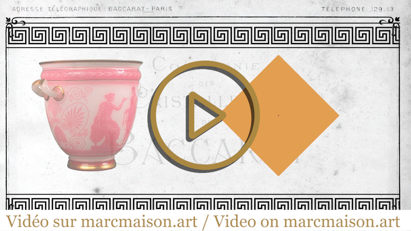 Bien que jusqu’à aujourd’hui notre vase soit le seul connu alliant la forme cratère et le rose, d’autres modèles au décor similaire existent en bleu ou en jaune. De plus, ce décor de bacchanale sur fond blanc opale a été appliqué à d’autres pièces de la production de la cristallerie que nous retrouvons dans les collections muséales, tels qu’au Corning Museum of glass, au Chrysler Museum à Norfolk aux Etats-Unis, au musée d’Orsay ou encore dans les collection du Petit Palais à Paris.